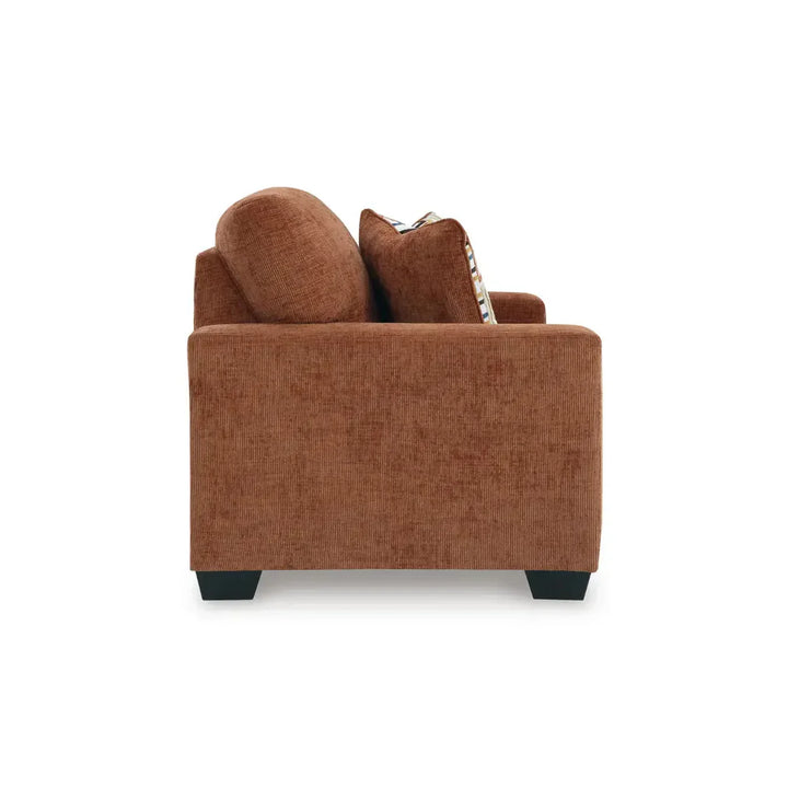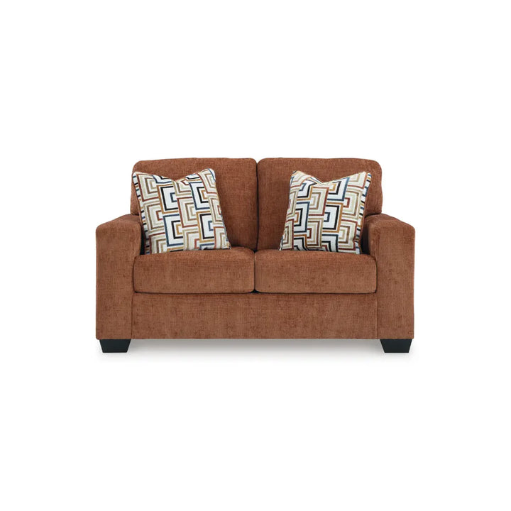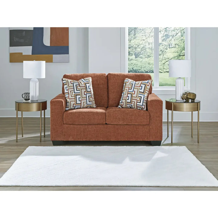 Looking to make a simply chic statement with color? Liven up your living room with this loveseat. Its trend-right light neutral upholstery is a perfect blank canvas for adding pops of color. Bold and eclectic accent pillows complete the look. Pairing posh style with everyday comfort, this piece is a welcome addition to contemporary spaces.