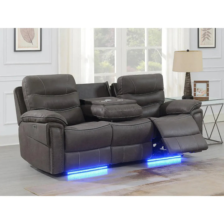 Introducing the Kwality Morgan Power Reclining Leather Sofa Collection-Sofa, the epitome of luxury and comfort. This collection features a sofa with power recliners and power headrests, complete with a convenient drop-down tray equipped with a wireless charger and USB port. The loveseat boasts two power recliners, power headrests, and a console with cup holders, storage, and an additional wireless charger. With LED lights on the bottom for added ambiance, this sofa set is wrapped in durable Leathaire material, ensuring longevity and easy maintenance. Designed for ultimate comfort, it features generously padded arms, a high thick back, cup holders, and premium quality upholstery, making it the perfect addition to any living space.